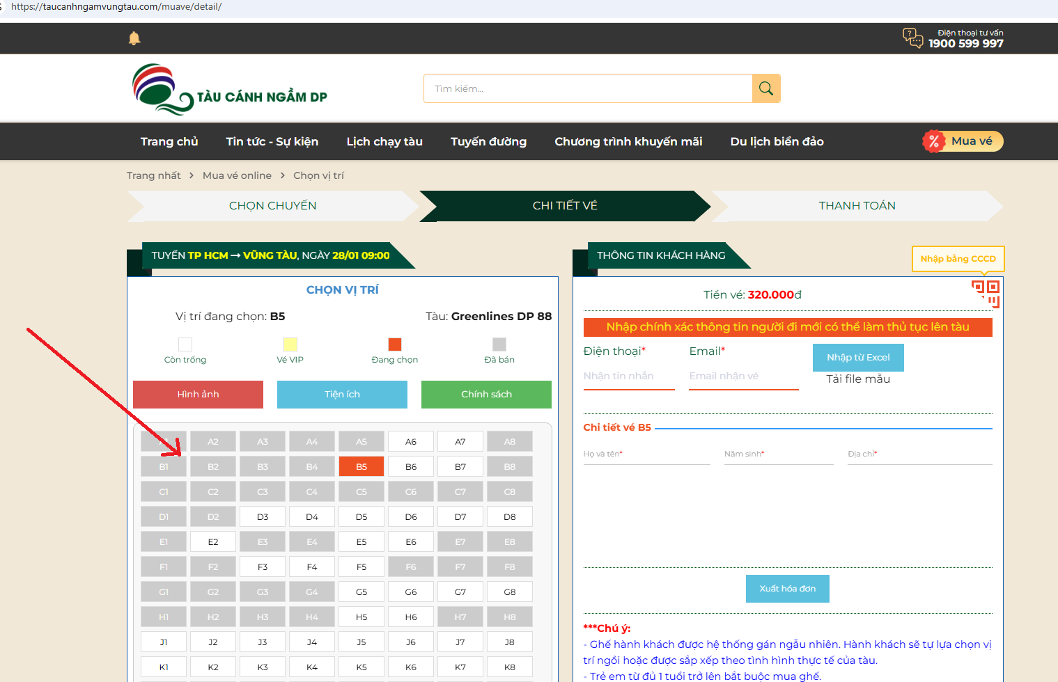 Bước 2: Bước tiếp theo chọn vị trí ghế ngồi trên tàu cánh ngầm và nhập đầy đủ thông tin hành khách đi tàu để nhận vé điện tử.